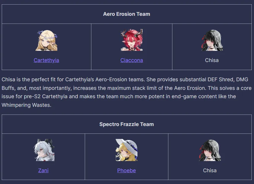 您拥有或计划建立 DoT 团队: 如果你已经拥有像卡泰西亚或扎尼这样依赖负面状态效果的角色,Chisa 增加最大 DoT 堆叠并提供 DEF 忽略的能力对他们来说是不可替代的、变革性的升级。