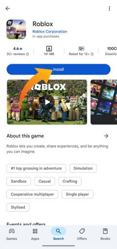 找到应用程序后,点击获取或 安装 将其重新安装在您的移动设备上。重新安装后,打开应用程序并登录到您的Roblox帐户。