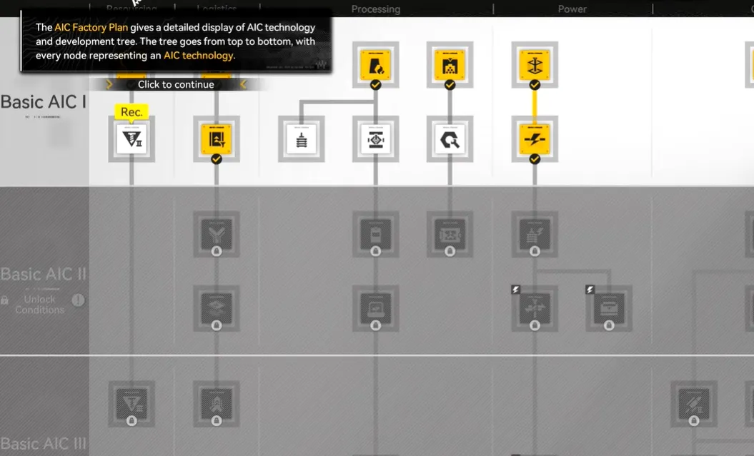 3. 专业提示 – 中继分配:解锁基本 AIC III 后,立即研究中继分配节点。此升级在中继塔周围创建了一个小型发电场,使您可以直接为建筑物(包括滑索)供电,而无需额外的电塔,从而节省大量资源。