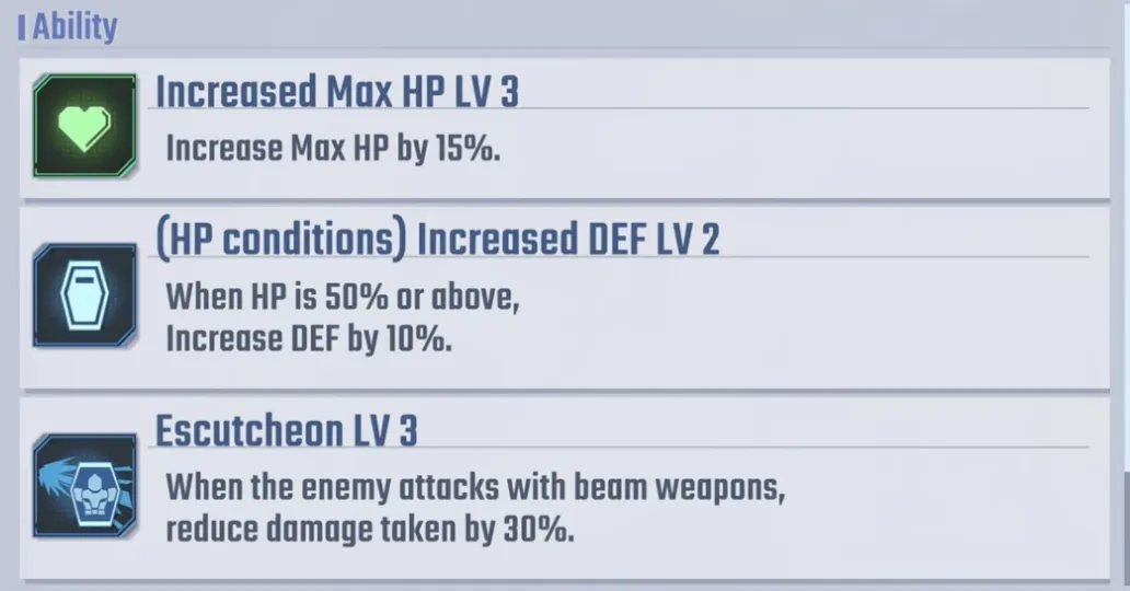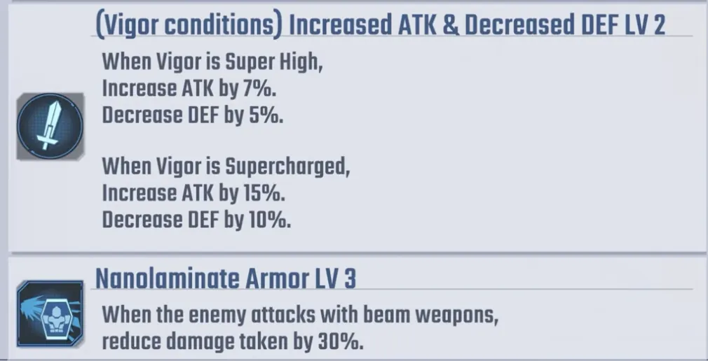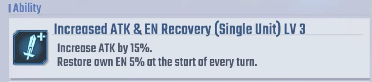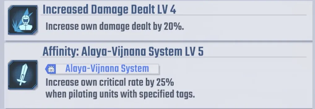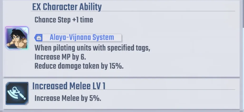 他的能力包括 20% 伤害增加、25% 暴击率提升,以及驾驶具有阿赖耶识系统的单位时的特殊奖励。