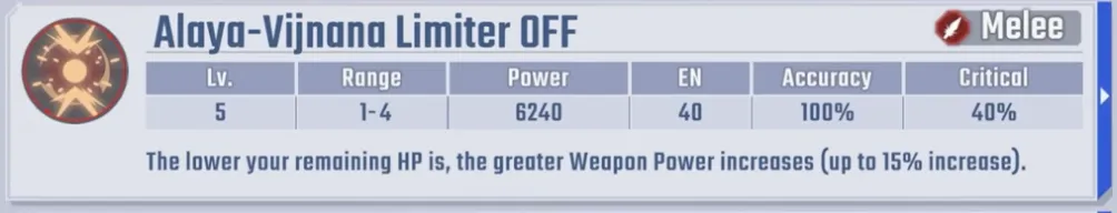 最值得注意的是,他的 EX 能力赋予他无条件的三重行动。当驾驶具有阿赖耶识系统的单位时,他还获得+6 MP和15%的个人伤害减免。