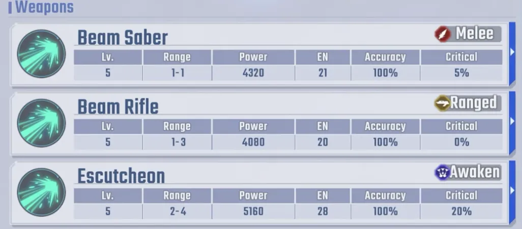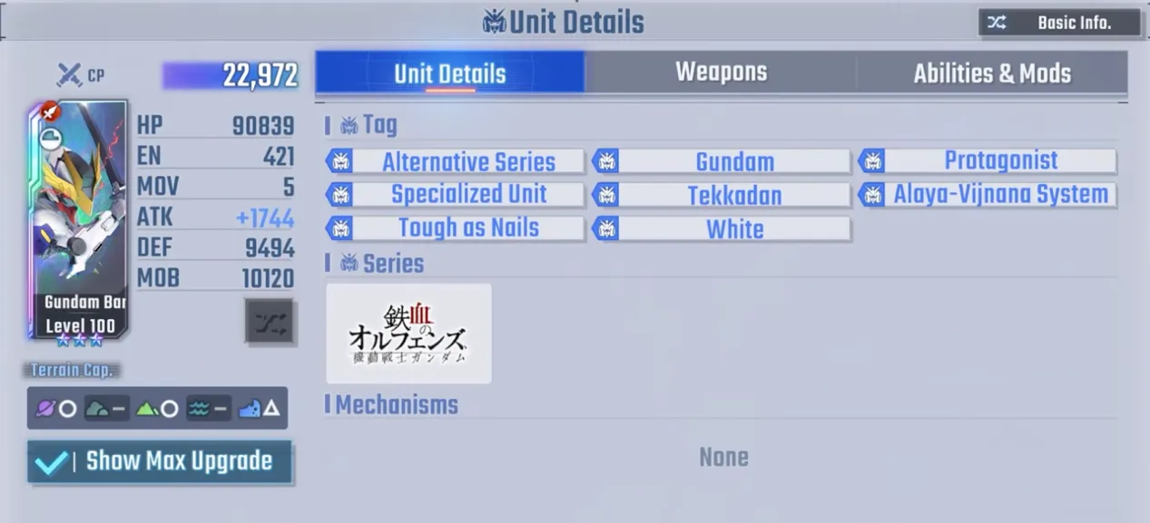 该机体机动性为5,EX成本为57,射程为1-4,动力为7080,与Z高达相当,符合限定机体的标准。