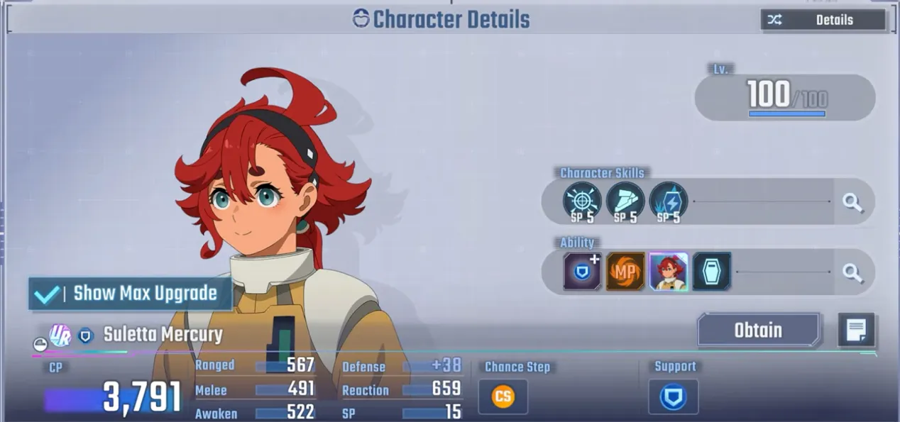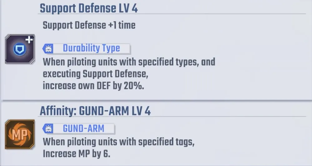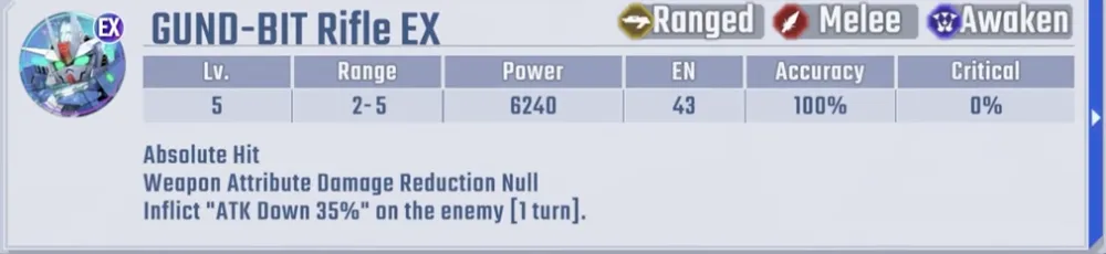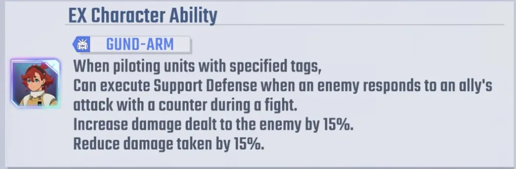 她的EX能力非常独特:当驾驶带有GUND-ARM标签的单位时,当盟友的攻击被敌人反击时,她可以进行支援防御。