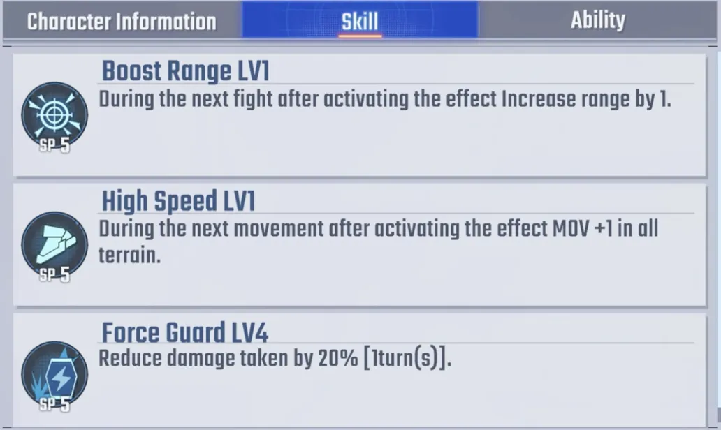 她的技能包括射程 +1、移动力 +1 和 20% 伤害减免等实用选项,但缺乏治疗技能是一个小弱点。