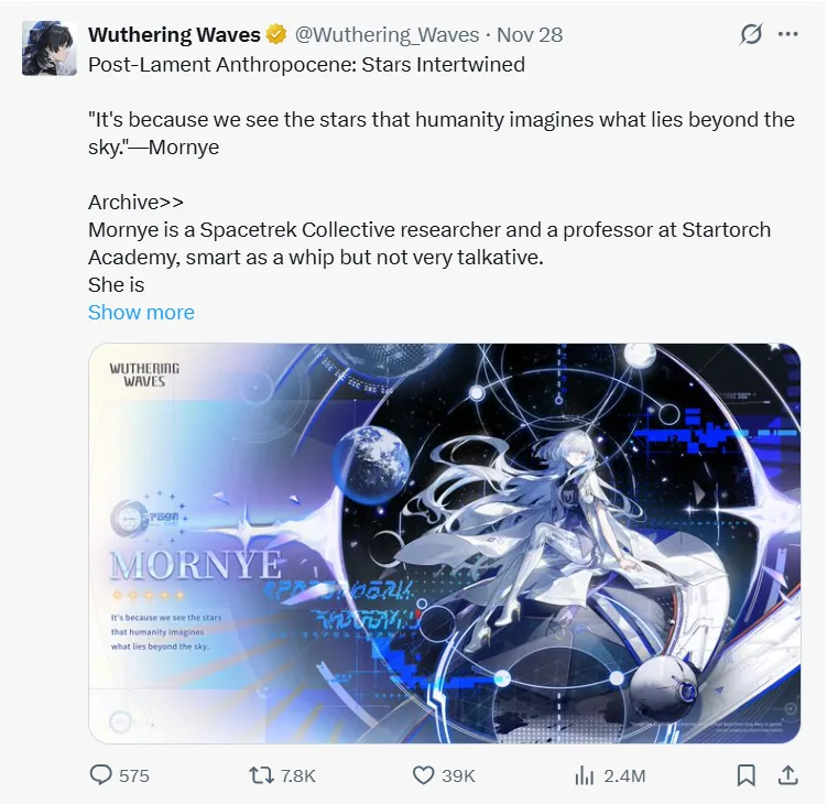 Mornye拥有独特的设计风格,并保持一贯的高关注度。讨论集中在她的角色和独特的外表上。她的外表吸引了大多数玩家,让她拥有很高的人气, 仅次于林奈。
