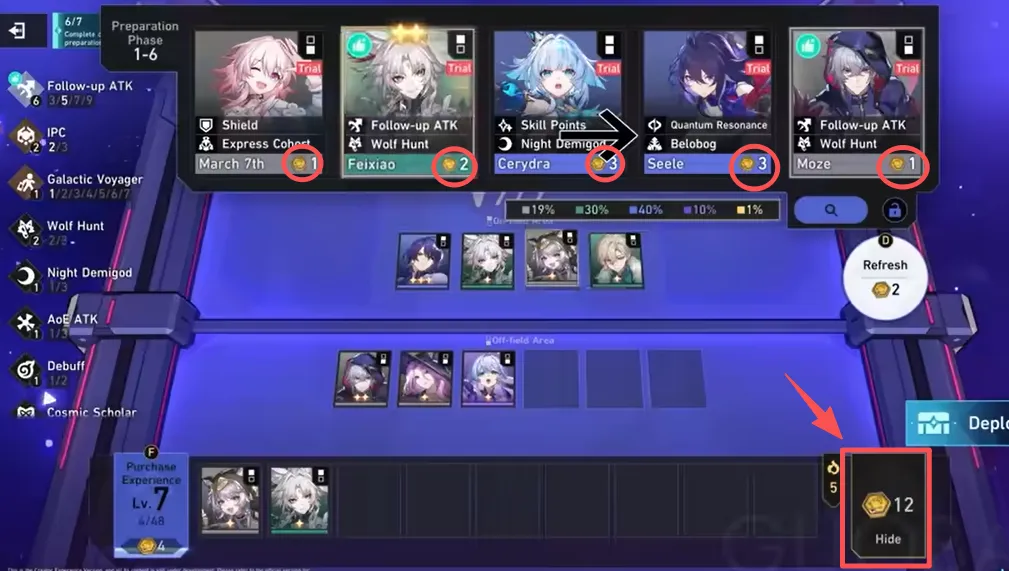 - 场外(6 个字符): 这些单位会自动行动,根据其独特的场外赋能能力提供支持、后续攻击或增益。