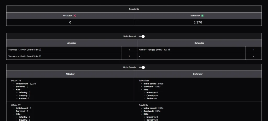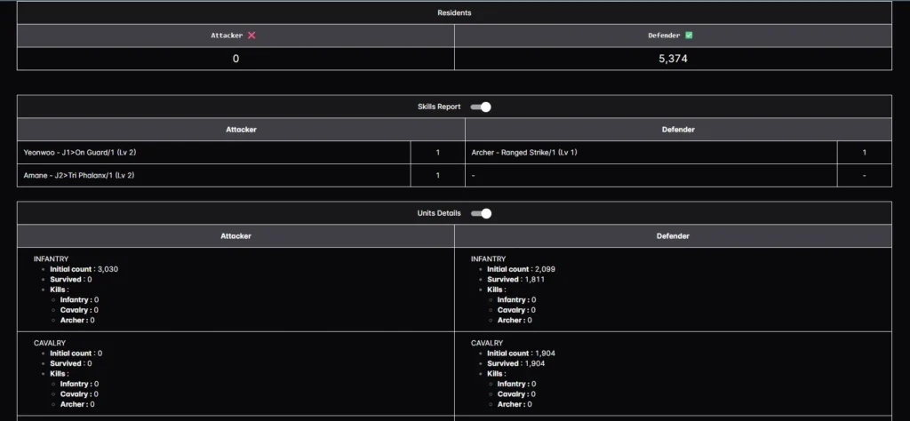在第一次测试中,我使用了 2 名 Yeonwoos 作为加入者,导致 185 名防守者死亡。在第二次测试中,我保持所有内容相同(因为所有帐户都是我的),但使用 Yeonwoo + Amane 作为加入者 – 这次,防御者有 187 人死亡。