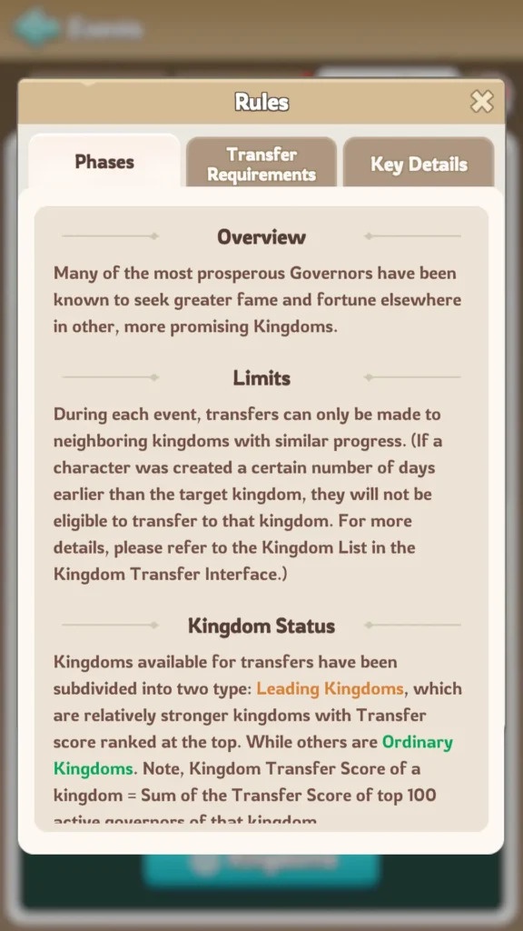 活动期间,转移仅适用于与您当前王国进度相似的邻近王国。这意味着以下