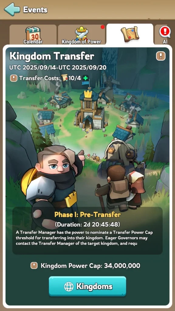 王国转移终于被添加到游戏中,第一次发生在 2025 年 9 月 14 日至 2025 年 9 月 20 日之间。此事件允许统治者转移各自分组中的王国。