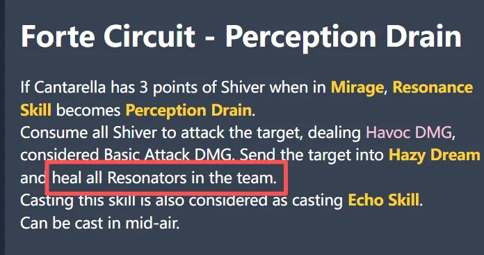 坎塔雷拉的叠穿依靠的是她的独特 海市蜃楼 和恍惚/颤抖系统。她通过使用入门技能、共鸣技能和共鸣解放进入幻影,从而允许她随后释放至少两种变异技能——闪烁幻想和感知汲取——这两种技能都被视为回声技能。这种机制将她的堆叠分布在一个相对较长但自给自足的组合中,为加尔布雷纳提供了 Afterflame 堆栈的平滑、持续和可预测的积累。