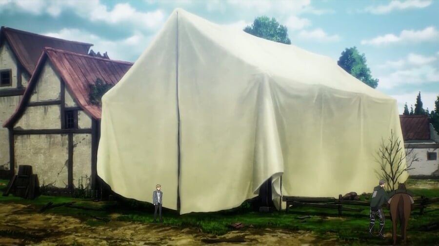 在介绍之后,当琼和三笠在不同的房间里等待时,隆隆声在晚上播放。 安妮看着隆隆声,希奇安详地睡在她旁边的床上。 Reiner 在与 Eren 的战斗和他的硬化被强行解除后仍然昏迷不醒,但这一次在他旁边显示了两个苹果,大概来自 Gabi,他被显示骑马前往 Ragako 村,Armin 带路。