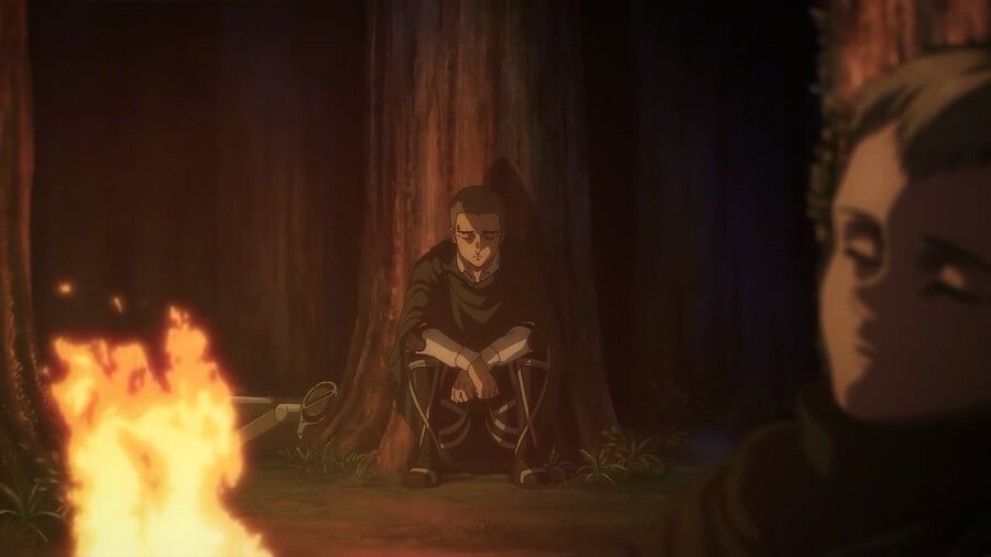 这一集的前半部分集中在安妮——她的硬化水晶被艾伦的创始泰坦力量所破坏——向希奇讲述了她的人生故事。 这一集的后半部分显示了核心四人(现在是三人)与阿明、三笠和琼之间的一些分歧。 三笠恳求阿明留下而不是追赶康妮——康妮绑架了法尔科给他在拉加科村的妈妈喂食——而琼则对三笠大喊让她自己思考。