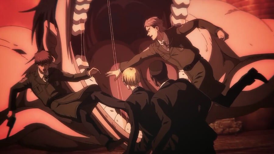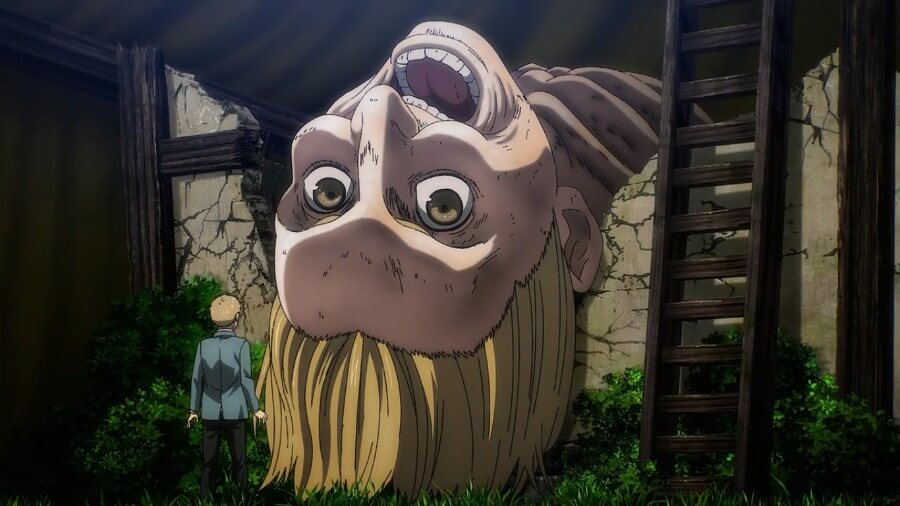 马加特问他是否打算杀死泽克,那么泽克在哪里? Hange 推测 Zeke 已被 Eren 吸收,以使用 Zeke 的皇室血统来启动建国——Ymir 将其遗赠给 Eren,而不是使用权力来制定 Zeke 的安乐死计划。 汉格说,她知道创始会非常庞大​​,似乎不可能被击败,这就是为什么她恳求他们在片头字幕播放之前联合起来(“隆隆声,隆隆声,它来了!”)。