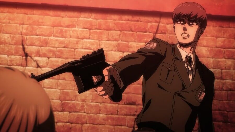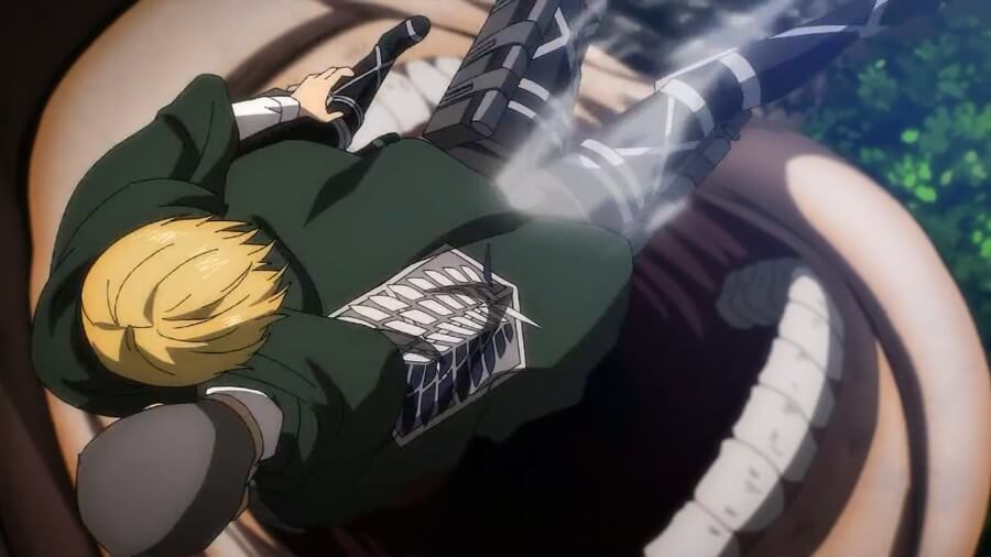 阿明眼中带着痛苦,脑海中闪过欧文·史密斯的情景,他要求加比在起飞前原谅康妮,看起来他要攻击康妮。 相反,阿明落在康妮妈妈嘴上方的木板上。 他凝视着深​​渊,然后眼里含着泪水,说他会通过他的行动向康妮展示。 他开始朝嘴巴下坠。 在慢镜头中,康妮意识到发生了什么,将法尔科扔到一边,并在阿明妈妈闭嘴之前救了他。