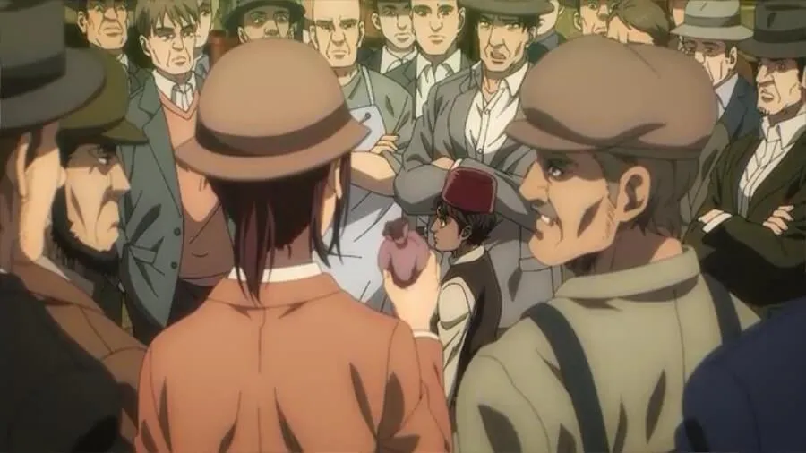 他们切入了一个集会,一个男人为世界各地的伊米尔臣民寻求援助。 他认为他们与艾尔迪亚帝国的“致命意识形态”无关,他们的仇恨应该针对帕拉迪斯岛。 他称“岛魔”为真正的敌人,并得到了人群的热烈掌声。
