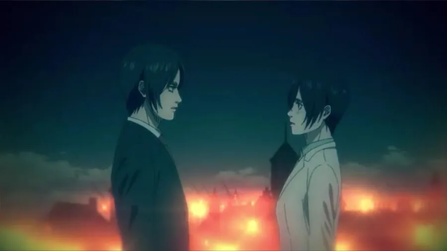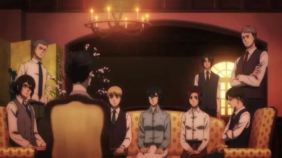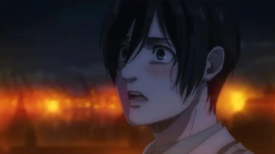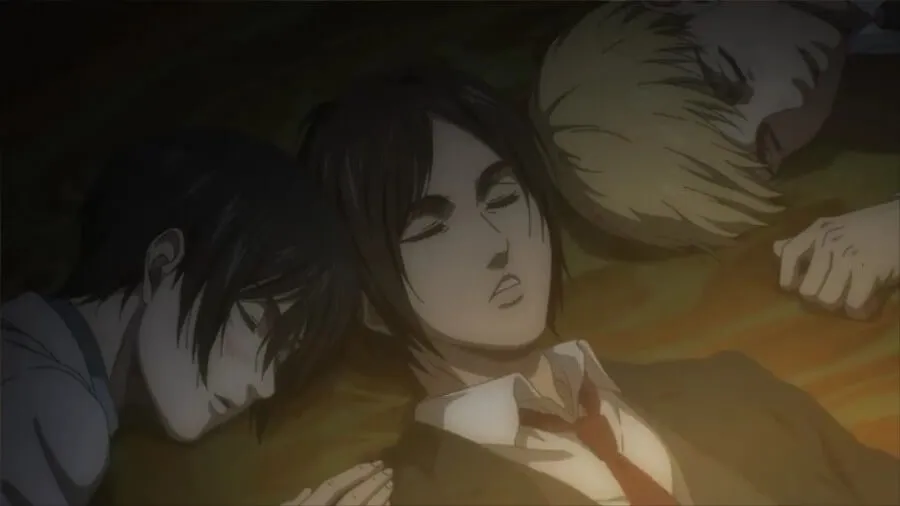 当艾伦离开大厅时,三笠转身看到艾伦的背影,她实时叙述,这是他们最后一次见到他,直到对利比里奥的袭击见证了战锤泰坦威利·泰伯和萨沙的死亡,后者是加比拍摄。 她说,他们后来从他那里收到的信将一切都托付给了 Zeke 的计划,下次他们在利比里奥见面时,“已经太晚了。” 她想知道一切是否总是如此,但她不禁想到,如果那天她在俯瞰难民营时做出不同的回答,情况会有所不同。
