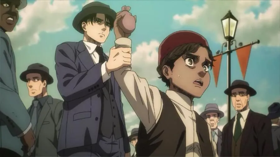 突然,利威尔一把抓住男孩,说没有人称他为扒手,只是钱包不是他的。 Levi 说它属于 Sasha 中孩子的“姐姐”。 当商人打电话给他们讲故事时,莱维和其他人迅速远离愤怒的暴民,暴民愿意对儿童实施暴力。 他们逃跑了,当利威尔寻找男孩时,他们看到他眼含泪水向他们挥手……手里拿着一袋硬币。 利威尔检查了一下,这是孩子手里的包!