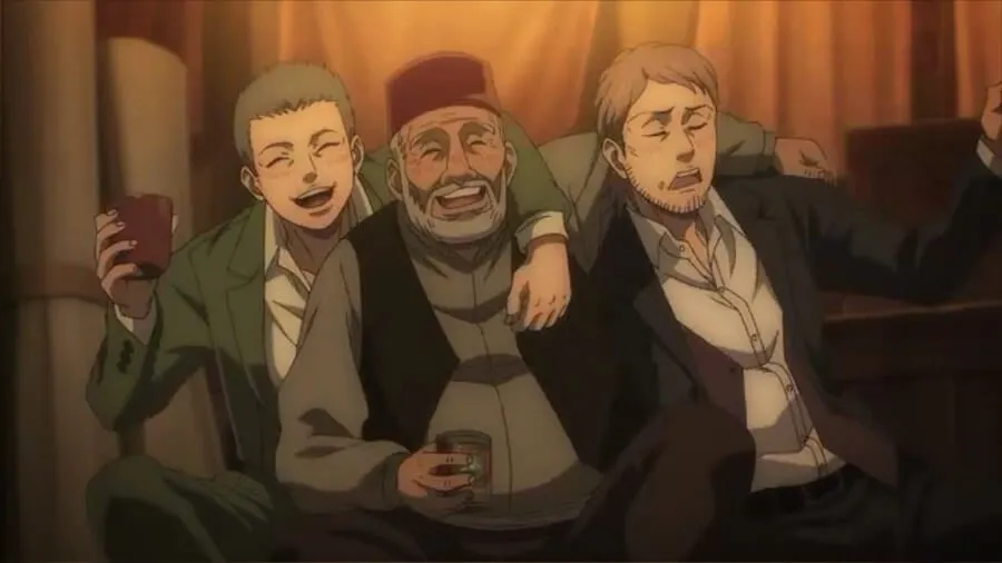 他给艾伦倒了一些伏特加(大概),艾伦一口气喝了下去。 其他人效法艾伦的榜样,然后放下酒水。 一场欢快、醉醺醺的宴席上演。 当酒精用完时,整个营地都加入了他们所面临的压迫之海中进行了一场盛大的欢乐庆祝活动。 Levi、Hange 和 Onyankopon 在夜深人静的时候来到了其他人,看到每个人都昏迷不醒,甚至还有一个人在后面呕吐!