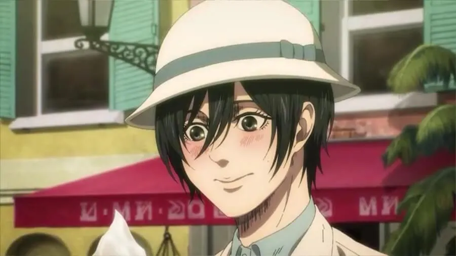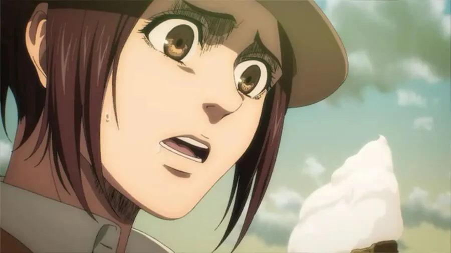 三笠把她的蛋筒带到艾伦面前试试。 他提到他只从“老人的记忆”(Grisha’s)中知道冰淇淋,而拘留区内的艾尔迪亚人很少有机会吃冰淇淋。 三笠随后实时讲述他们没有注意到,或者更确切地说拒绝注意到艾伦的变化。