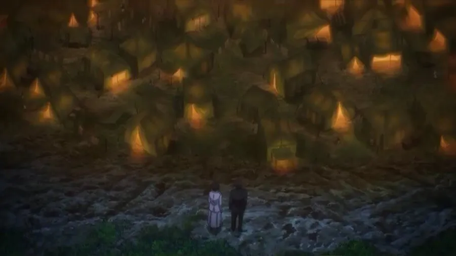 突然,三笠意识到艾伦不见了。 晚上,艾伦站在山顶上,看着早先的男孩跑到他的家人身边。 三笠上前责骂他,因为他是敌人的目标,然后注意到他擦了擦眼角的泪水。 他们低头看那相当于一个巨大的难民营,人们在生活被战争破坏后聚集在一起生存。 艾伦说,这些人被剥夺了自由。