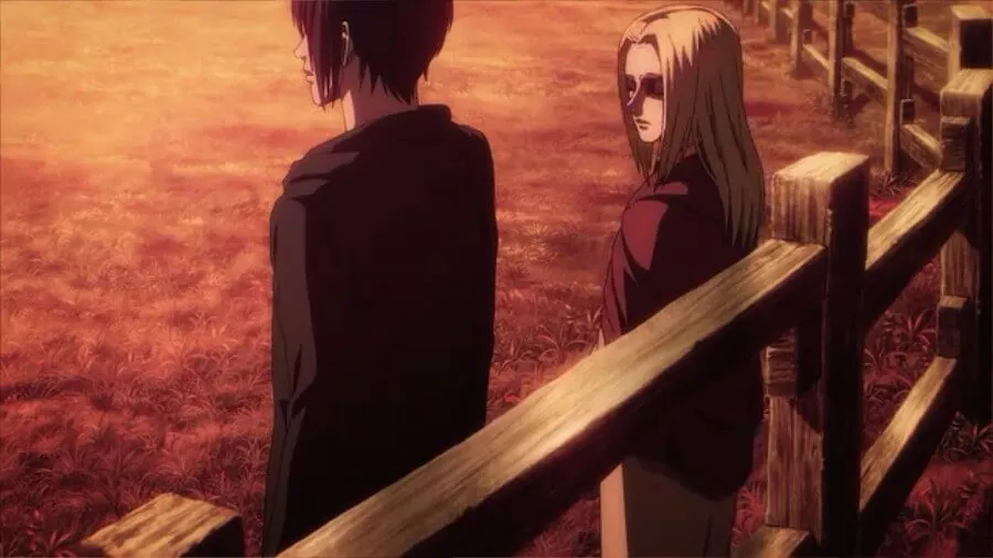 当他透露他消灭人类和他的敌人的计划时,他与弗洛赫和希斯托利亚的讨论之间的场景中断了。 Historia 告诉他他犯了一个巨大的错误,并不是墙外的每个人都是他们的敌人。 她告诉他,大多数人都会像艾伦的母亲卡拉一样死去,甚至不知道为什么。 艾伦确认了她的担忧,但表示打破仇恨循环的唯一方法是“将这段历史与创造它的文明一起彻底埋葬”。