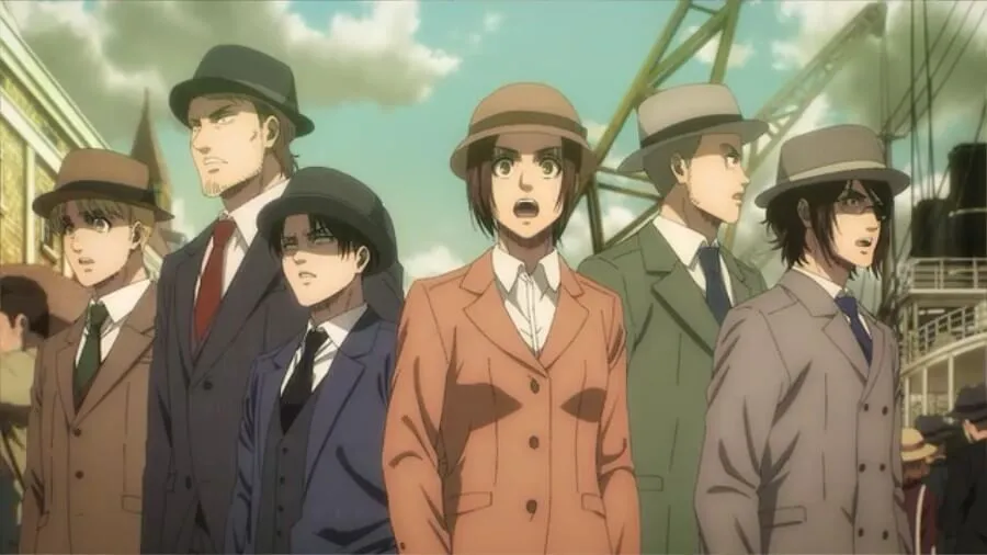 当 Connie、Jean 和 Sasha 在一艘船的甲板上,对墙外的世界感到惊讶时,出现了倒叙。 琼告诉康妮不要那么大声地谈论墙壁,但萨沙自豪地宣布了他们的身份,让琼懊恼不已。 当她说开始调查时,Hange 与 Levi 和 Armin 站在一边。 他们都穿着与标题屏幕显示的似乎是豪华班轮上的人相称的衣服。