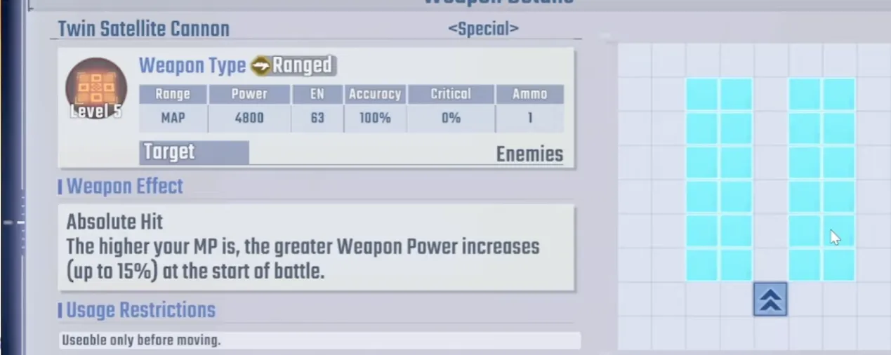 - 顶级清算能力: 其MAP武器“双卫星炮”拥有独特的 2×6 线范围,比标准 3×5 更宽。基础力量为 4800,受到“MP 增加力量”效果(最多 15%)的提升,在增压时力量达到 5520。它的垃圾清理效率在所有攻击型单位中名列前茅。