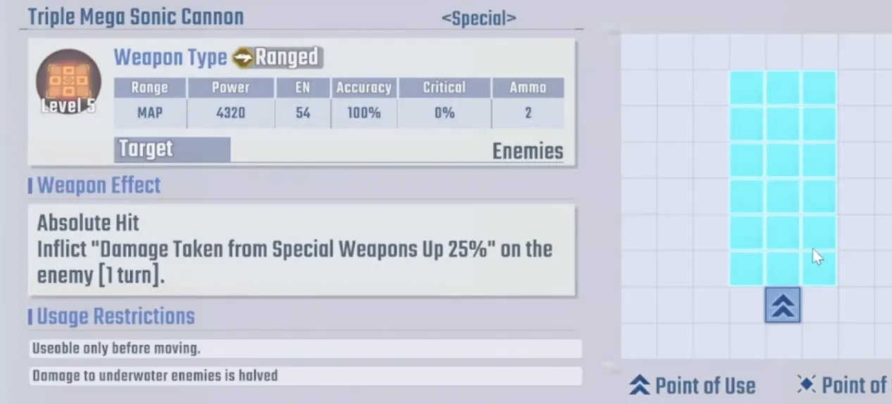 - 优质地图武器: MAP武器“三重兆音波炮”具有 3×6 范围并施加“受到的特殊伤害 +25%”减益效果。虽然其功率 (4320) 是辅助的标准配置,但范围和效果非常出色,平衡了清除和辅助。
