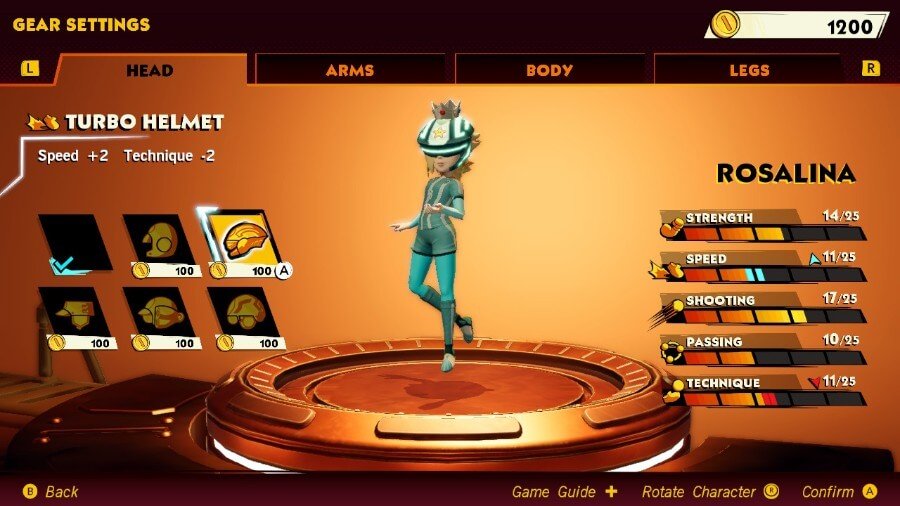 通过装备装备,你可以 调整马里奥前锋对战联盟中每个可玩角色的属性. 您可以装备的装备类型是 头、手臂、身体和腿. 每个项目通常会提高一个属性,同时降低另一个属性作为权衡。
