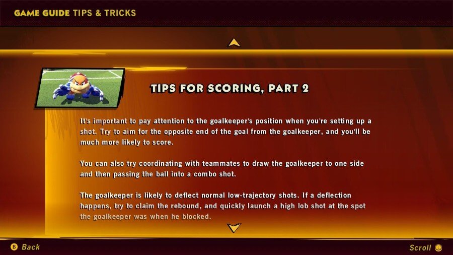 马里奥前锋:战斗联盟包括一个方便的游戏指南,其中 可以通过点击菜单屏幕上的 +(加号)来访问. 游戏指南中有许多可供探索的选项,包括角色、竞技场,但也许最重要的是,提示和技巧部分。