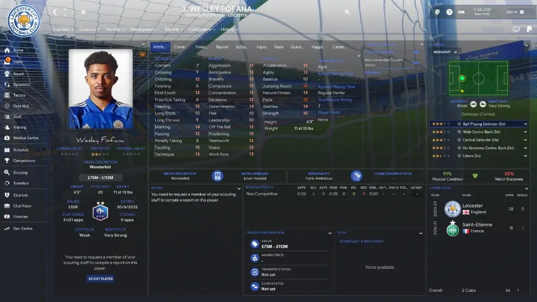 我们从 FM22 中最好的法国年轻球员 Wesley Fofana 开始。 这位 20 岁的莱斯特城中后卫被证明是切尔西等球队的热门球员,他们对今年夏天签下这位法国人非常感兴趣。