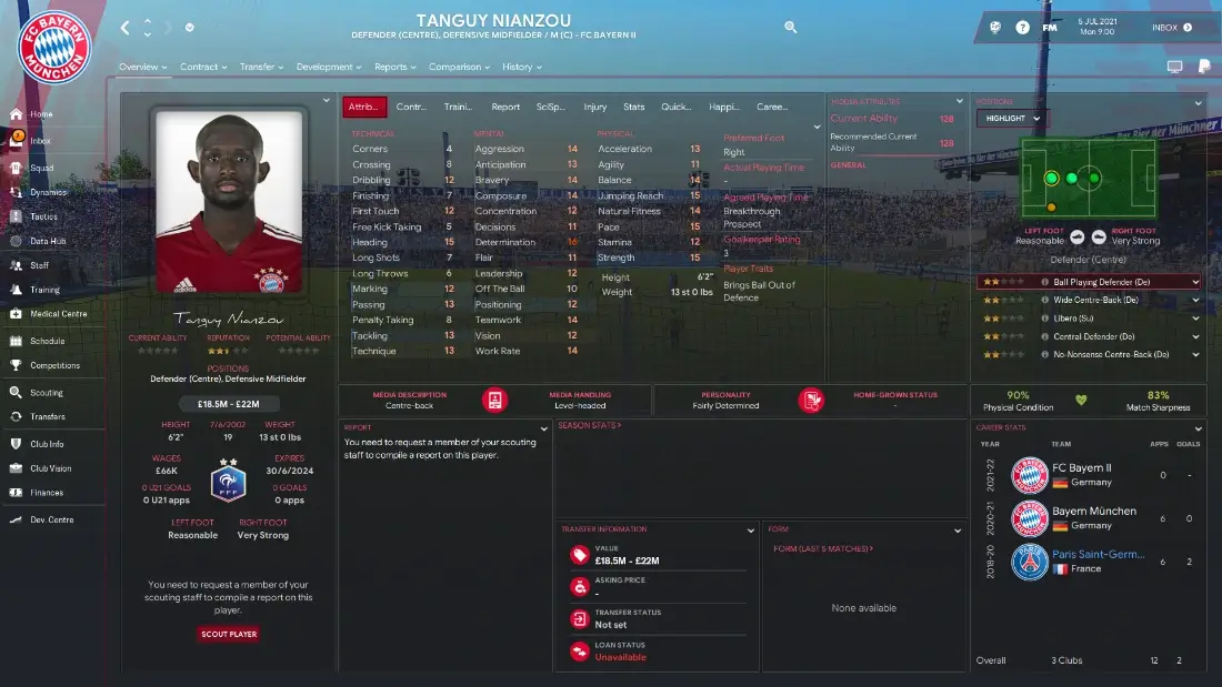 19 岁的 Tanguy Nianzou 目前正在德国为拜仁慕尼黑效力,他的 161 PA 让他成为一个非常有吸引力的转会目标。