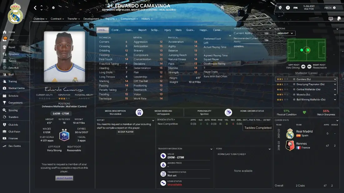 高度评价的中场球员爱德华多·卡马文加是冠军联赛冠军皇家马德里队的一员。 Camavinga 拥有令人难以置信的 PA,并且在正确的培养下,他的 136 CA 将很快爆发。