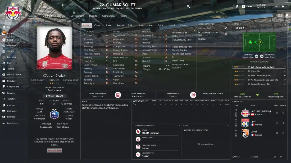 我们的第三位法国人是 Oumar Solet,他目前效力于奥地利的 RB Salzburg。 他负担得起的价格、166 PA 和 130 CA 使他成为任何球队的有吸引力的补充。