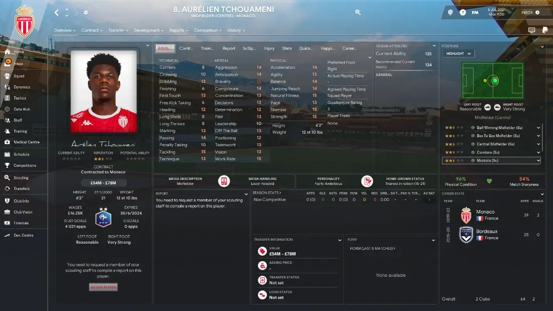 如果您有预算,AS Monaco 的 Aurélien Tchouameni 将是一笔不错的收购。 他的 135 CA 相对接近他的 164 PA,他的数据已经令人印象深刻。