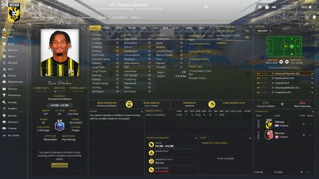 Fofana 具有非常高的 175 PA 潜力,并且已经以令人印象深刻的 148 CA 进行比赛。 他在技术、心理和身体方面拥有一些出色的属性。 这位 20 岁的球员拥有出色的空中能力,16 次起跳和 15 次头球,而且考虑到他身高 6 英尺 3 英寸,可以说他赢得了大多数空中决斗。 这在球场的两端都可以证明是有益的,而近角的常规动作可以让他获得相当多的进球。 他还有 16 步和 15 个位置,因此很可能能够跟上速度最快的前锋,同时在正确的区域应对任何迎面而来的威胁。 他的13 Anticipation也很可观,可以帮助他预测对手的下一步行动,而15 Tackling,Fofana也赢得了大多数挑战。