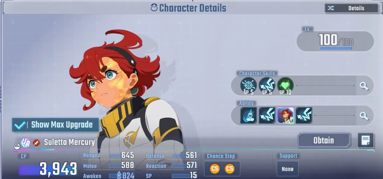 苏莱塔的角色是 功能性三效核心。她的主要价值在于驾驶 Calibarn,她将 EX 武器的 HP 成本降低至 5%,并通过她的主动技能提供至关重要的 60% HP 恢复,维持单位的高伤害性能。然而,这个治疗技能的SP消耗很高,需要指挥官在“持续”和“爆发”之间做出明智的选择。使用技能后她的觉醒属性可以达到983,虽然没有突破1000大关,但对于大多数场景来说已经足够了。总的来说,她是一名需要精心管理才能始终如一地将卡利巴恩的机械潜力转化为战斗性能的飞行员。
