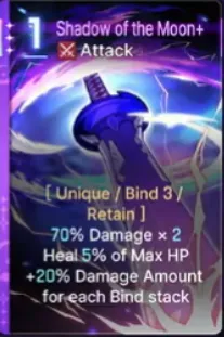 影响: (独特/绑定3/保留)70%伤害×2。治疗最大生命值的5%。每个绑定叠加 +20% 伤害量。