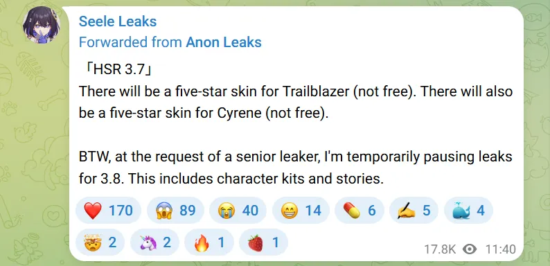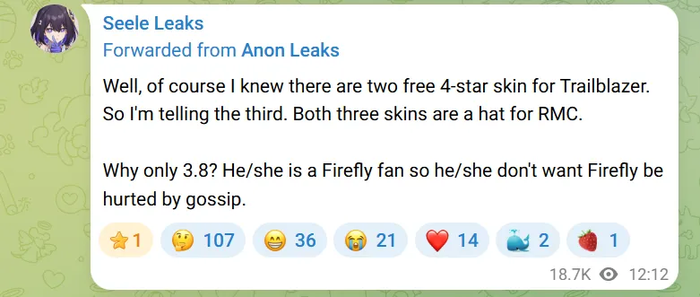 根据 Anon 的爆料,我们将在 3.7 横幅中加入 Cyrene 和 Trailblazer 的皮肤!伴随着令人兴奋的新消息,Anon 还宣布他/她暂时不会泄露有关 HSR 3.8 的信息,以保护 Firefly 免受八卦。
