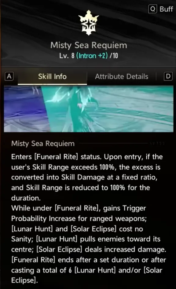 终极版 – 迷雾海安魂曲: 这是她的核心技能。它赋予(月球狩猎)人群拉动效果并增加(日食)的伤害倍数。它还增加了远程武器的触发概率,与她的被动技能效果产生协同作用。大招消耗大量理智,所以适度叠加技能效率是非常有利的。