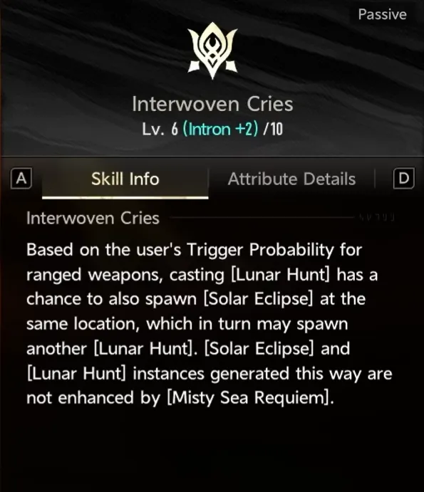 被动-交织的哭声: (日食)或(月狩猎)生成后,有一定几率额外生成(日食)或(月狩猎)进行补充伤害。额外生成的(日食)和(月狩猎)不会受益于大招的射程增加和伤害提升;他们只有标准的技能范围和伤害。然而,这些额外生成的技能仍然可以触发更多世代。