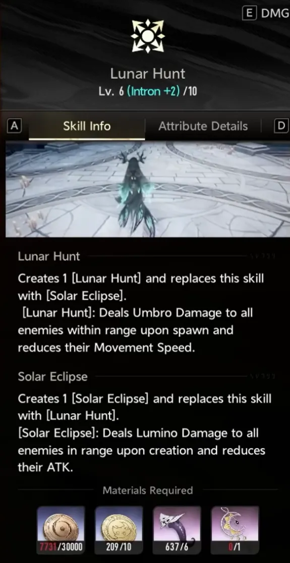 技能-狩猎月球/日食: 茵宝属性(月光狩猎)降低命中时的移动速度,而光属性(日食)降低命中时的攻击力。这是她的核心伤害技能。在正常状态下,它们的作用范围较小,倍数也较低,因此在她的终极能力状态下使用时最为有效。 《月之狩猎》的移动速度降低和《日食》的攻击力降低,再加上大招的范围增强,使她在群体场景中表现得异常出色。