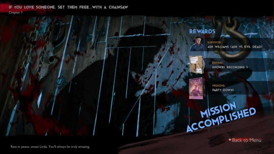 完成任务“如果你爱某人,让他们自由……用电锯”,你将解锁 Ash Williams(As vs Evil Dead 变体)、Knowby Recording 1 和 Mission II:“Party Down!” 您可以通过点击任务菜单中的 R1 或 RB 以点击“附加”选项卡来收听录音和其他您解锁的内容。 录音会播放,但不显示字幕,很遗憾