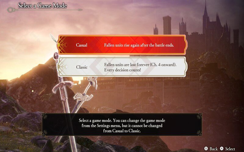 在休闲模式下,他们会在战斗后重新崛起,但在经典模式下,一旦你到达第 4 章,你的单位将不会复活。你可以随时从简单难度更改为困难难度,但 一旦您选择休闲或经典模式,您将无法更改 没有完全开始新游戏。