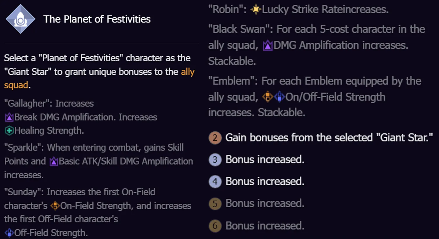 节日星球作为债券中的高级实用程序,提供可靠的节奏和团队范围的“呼吸”,可以顺利地融入大多数高级比赛。当前的元构建(例如 Phainon)通常运行 4 个节日 + 4 个能量作为骨干,因为每个节日单元都会提供高价值的增益,从而放大携带的伤害、缩放和整体一致性。它的阵容还与 Phainon、Sunday 和 Firefly 等顶级表演者完美融合,使 Bond 成为最容易搭配的产品之一,而不会影响您的主要策略。