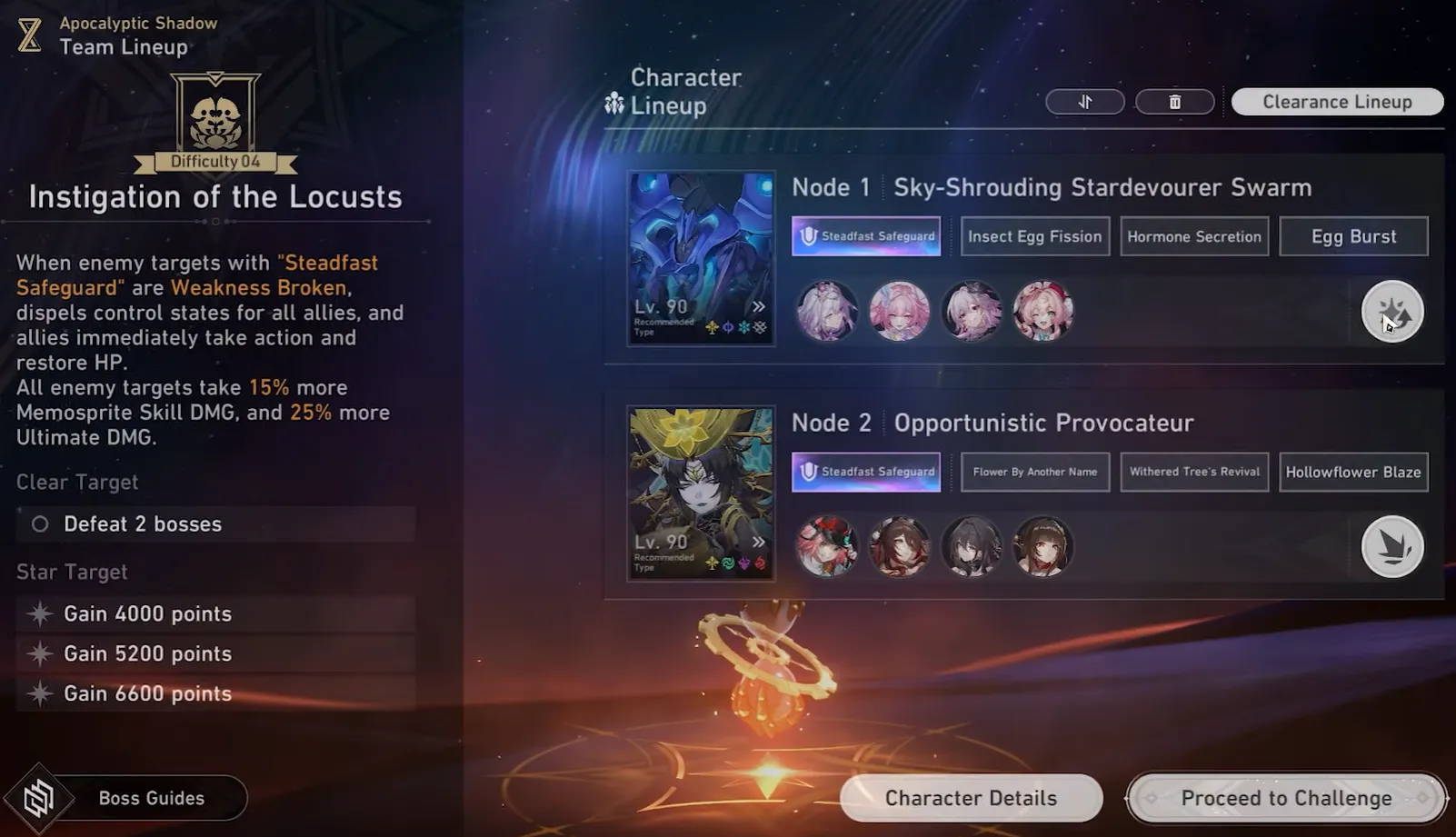 这 机会主义挑衅者 战斗取决于你先爆掉哪个莲花。芬蒂利亚定期召唤 丰富(黄色)和毁灭(紫色)莲花;打败一个人就会驱散她 韧性保护 并额外应用 韧性降低, 打开一个干净的突破窗口。至关重要的是,你优先考虑的莲花决定了你在剩下的战斗中会叠加的增益效果: 充裕度→全系伤害提升 (最适合直接伤害团队), 破坏 → 破坏效果增强 (非常适合 Break 组合)。尽早获得正确的增益,然后自由地清除后续的莲花,以保持弱点的释放并推动节奏的突破。
