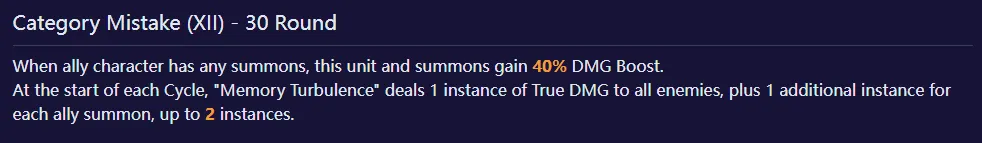 当该单位有召唤时,该单位及其召唤物均获得 伤害提升 40%。在每个周期开始时,它会处理 1加上真实伤害的召唤次数 对所有敌人,每个周期最多攻击 3 次,每次攻击造成约 70,000-90,000 点伤害,非常适合清除敌人的召唤。