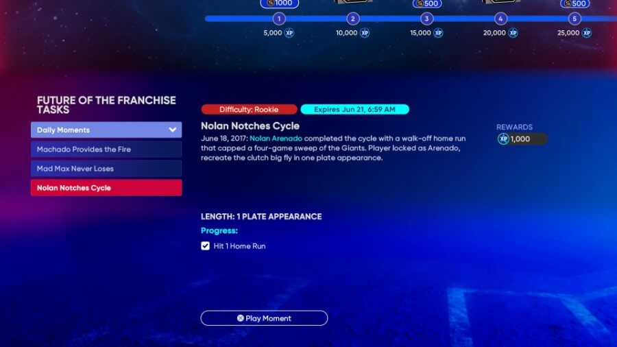 太平洋时间每天早上 9 点,都会添加一个新的每日时刻。 这些通常是简单的玩家锁定任务,例如在 6 月 18 日与 Nolan Arenado 一起击出本垒打(如图)。 完成每个每日时刻都会让你 轻松的一千次体验. 注意每一刻 持续三天,所以虽然你不必每天都做,但你必须在三天内做,以免失去轻松体验的机会。