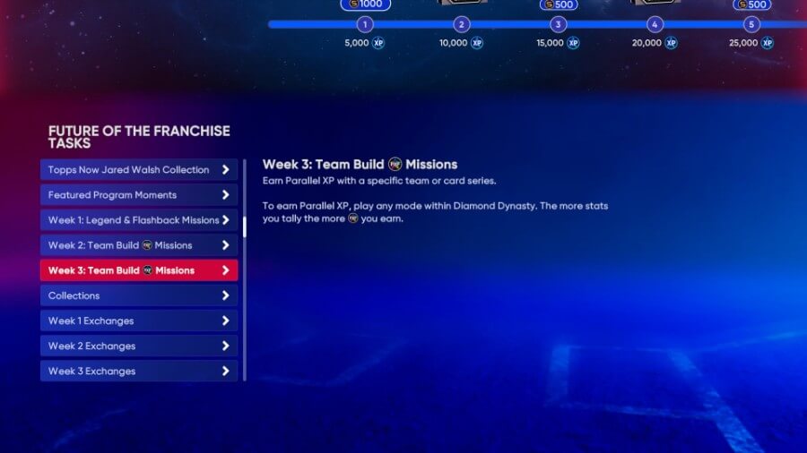 在大多数情况下,建造任务是要求您与来自团队、部门和不同类型卡片(新秀、前景等)的玩家一起获得一定数量的平行体验的任务。 对于当前计划,有两个不同的构建任务,都需要为所有六个部门获得并行经验。 首先是赚 每个部门有五千个平行经验. 二是赚 每个部门有两千个平行经验。 完成后,您将获得额外的 两三千经验到程序.