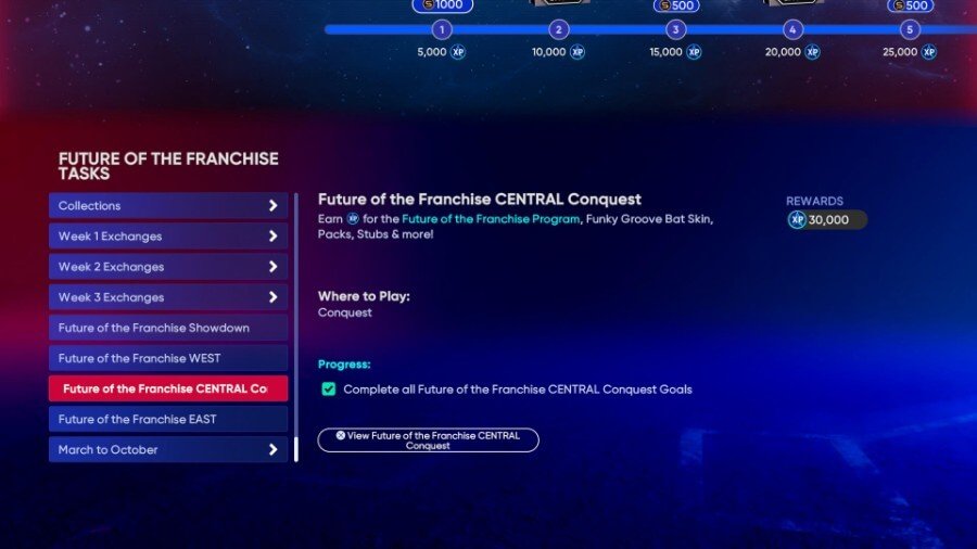 瞄准它们,因为当你完成它们时,你也会在主程序中添加大量的 XP。 例如,图中所示的特许经营中心征服地图的未来 增加3万经验值. 一般来说,这些地图和摊牌会 15到3万经验 完成时。 大多数节目都有两张征服地图和一张摊牌,尽管当前节目的长度和主题看到了三张征服地图,可能还会有更多。